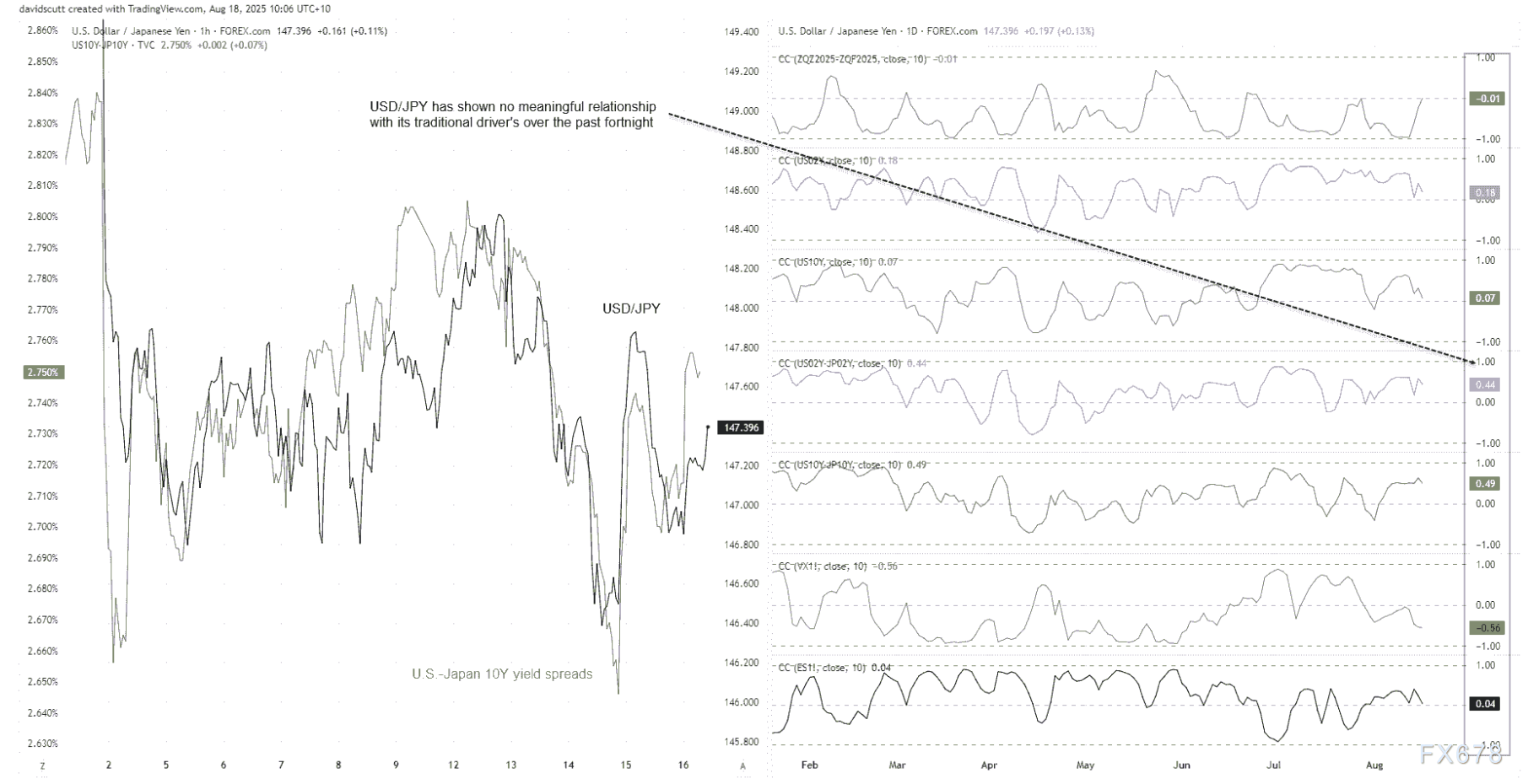 长期以来,美国利率前景、美日利差及整体风险偏好一直是美元兑日元的主要驱动因素,但本月却一反常态。相关性系数印证了这一转变——目前仅中美利差尚存些许关联,即便这种关联性相较历史水平也显得微弱不堪。显然,汇市已进入八月传统淡季,无论是利率还是外汇市场,鲜有交易员愿大举建仓。