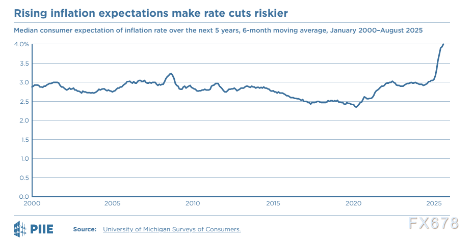 未来风险在于:几年前新冠疫情引发的通胀飙升,可能已削弱长期通胀预期的稳定性。面对关税政策再度推高物价,消费者、劳动者和企业对快速回归低通胀的信心或将减弱,更可能主动提高报价与薪资要求,从而使一次性关税冲击转化为通胀的自我维持性上升。事实上,如图表示,密歇根大学调查显示的五年期通胀预期已跃升至4%,显著超越疫情通胀峰值时期的水平。若这些高预期值持续存在并转化为更大的价格压力,美联储将不得不提高政策利率以使通胀回归目标区间——这可能使经济陷入衰退。