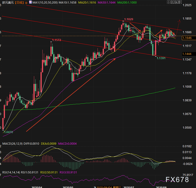 周四(8月21日)亚洲交易时段,欧元兑美元继续沿着50日均线,在1.1650一线窄幅整理,截至当前,汇价交投于1.1647附近,微跌0.02%,多空力量暂时均衡。美联储7月会议纪要释放的政策信号与特朗普对美联储官员的施压形成显著博弈,成为短期汇率波动的核心驱动。美联储会议纪要公布后,周三欧元兑美元快速从当日高点1.1672回撤,反映市场对政策预期的敏感反应。走势上交易员在提前押注欧洲各国PMI的放缓预期,使欧元兑美元承压。