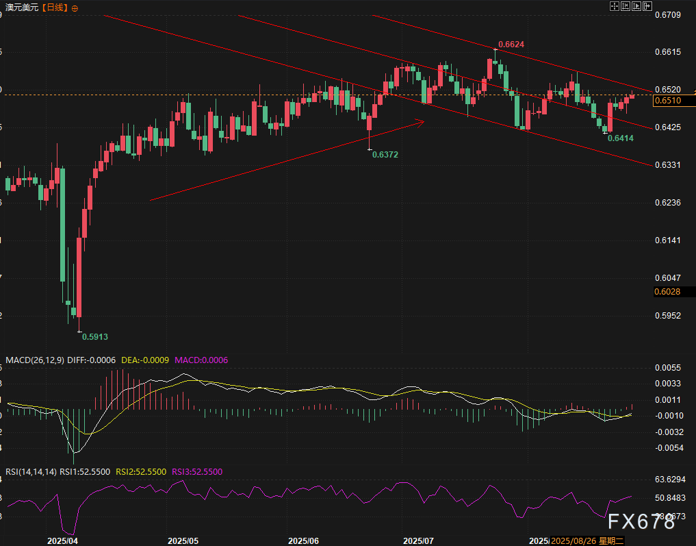 50日均线的0.6513是第一阻力位,后续汇价目标是突破此阻力以及下降通道上轨,并涨过8月13日的收盘价0.6550的高点。