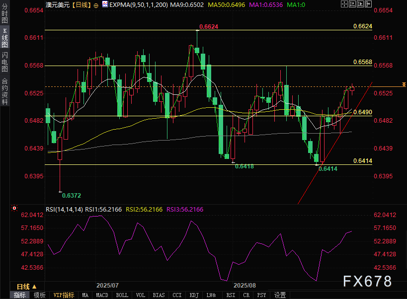 上行方面,澳元兑美元可能上探8月14日触及的月度高点0.6568,继而挑战7月24日创下的九个月高点0.6624。