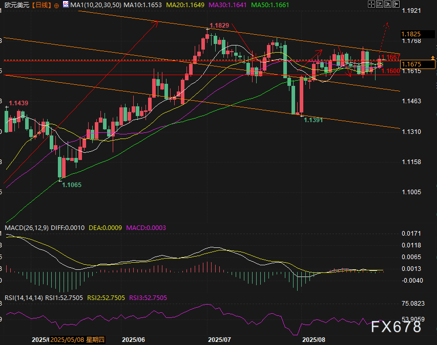 此前转入看空区间的相对强弱指数(RSI)已回升至看涨区域,表明多头当前主导市场。若该货币对当日收盘站稳1.1670(8月25日阴线50%回撤位)上方,将进一步夯实上行逻辑,后续关键阻力依次上看8月22日高点1.1742、1.1800整数关口,以及年内高点1.1829。