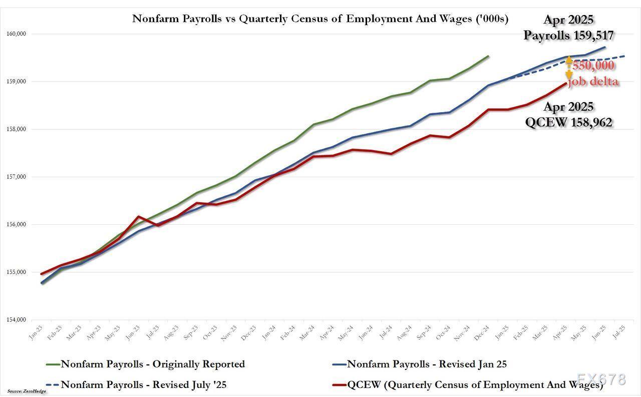 接下来,我们看看最新的QCEW估算数据。参考费城联储最新的初步基准调整数据,并沿用2024年3月准确预测80万人下修时所用的方法,我们发现,又一次大规模下修已“箭在弦上”。上图包含三条数据曲线:第一条(绿色)是劳工统计局最初公布的非农就业数据,但2024年12月前的数据已在2月进行了大幅修订——修订后的数据比修订前减少了61万个岗位;蓝色线是最新的非农就业数据,蓝色虚线则代表近期月度数据的下修情况;最后,红色线是费城联储公布的最新初步QCEW数据。与上次分析时一样,红色线显示劳工统计局再次大幅高估了就业数据——随着两条曲线趋于一致,我们预计,十天后的9月9日,劳工统计局将公布又一次大幅下修,届时美国劳工部将宣布:又有55万个就业岗位“从未存在过”
