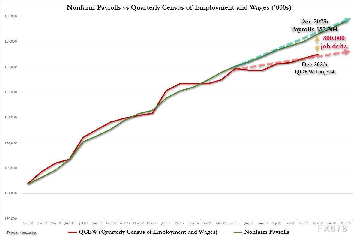 依据更为精准的《就业与工资季度普查》(QCEW)报告估算,“截至2023年12月,劳工统计局已高估非农就业人数80万;若将数据范围延伸至2024年,高估数字还会更高。从统计学角度看,每次数据误差都恰好偏向‘经济更强劲’(即便这是虚假的),这一现象实在令人震惊。”该分析还发现,2023年非农就业人数月度平均增幅并非白宫反复吹嘘的23万人,真实的月度平均增幅仅为13万人!下图中,绿色线代表劳工统计局最初公布的月度非农就业变动数据,红色线则代表依据QCEW得出的实际月度就业人数。