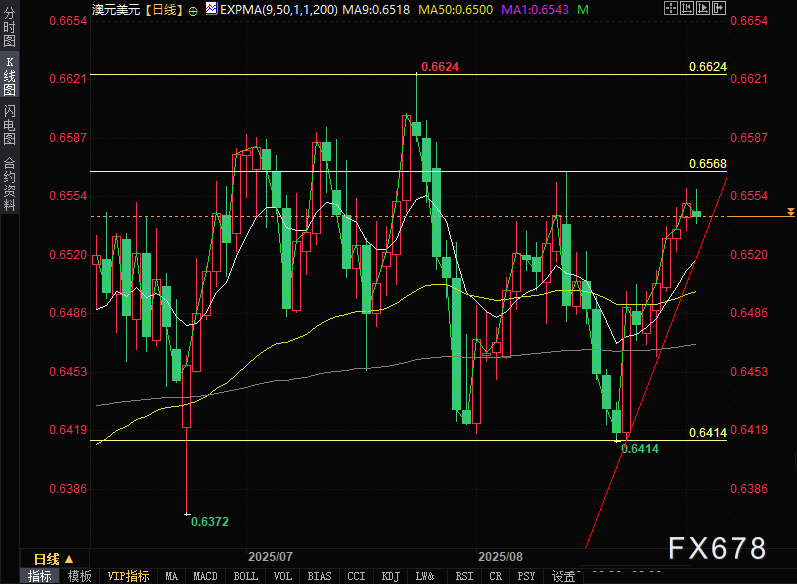 下行方面,关键支撑位见于上升趋势线与9日EMA重合的0.6520水平,其次是50日EMA所在的0.6500。若跌破该重要支撑区域,将暗示看空趋势启动,汇价可能下探8月21日创下的三个月低点0.6414。