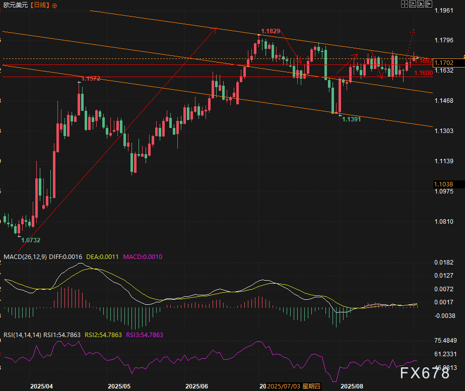 欧元兑美元技术面正处于看涨旗形的关键节点:当前交投于1.1720水平阻力下方,同时受7月1日1.1829高点延伸的下降压力线压制。