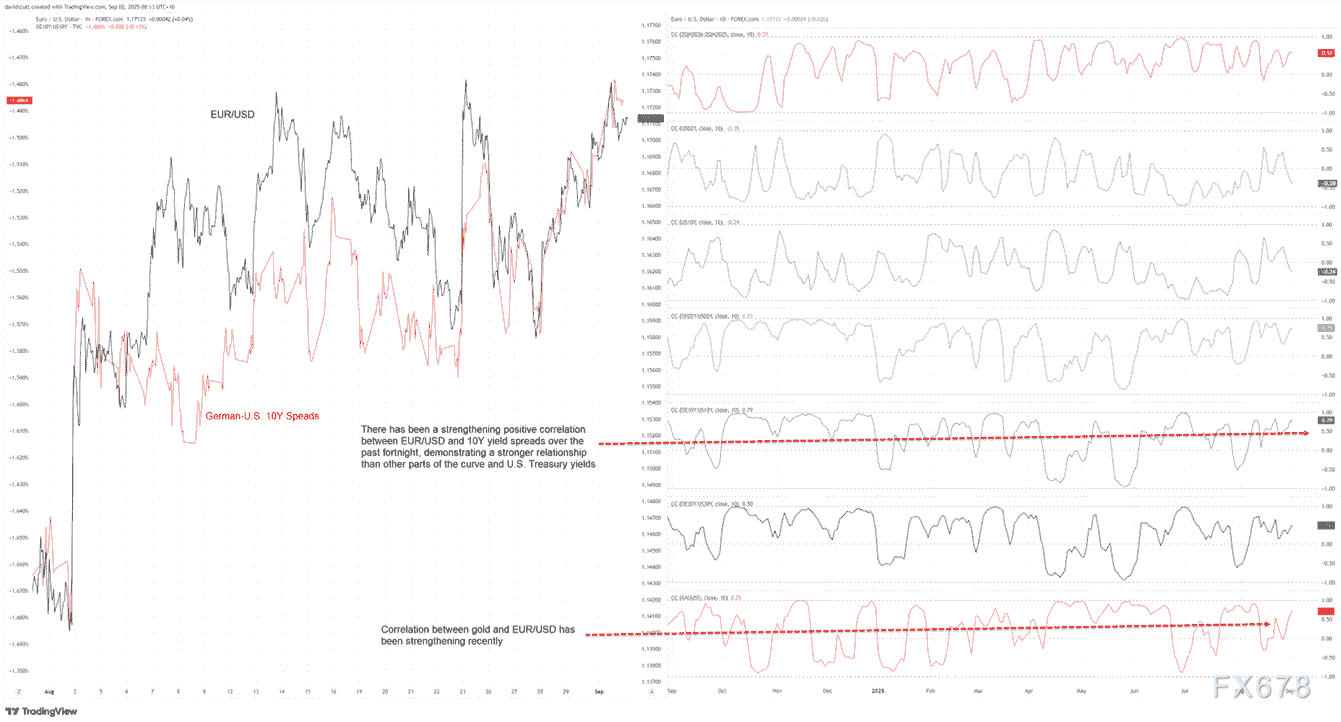 尽管该货币对与“2026年6月前美联储降息定价”及“美国国债绝对收益率”的相关性较弱,但与美德10年期国债收益率利差(后者常被视为欧元区债务的代理指标)的相关性显著居首,过去两周甚至出现了重合的走势。