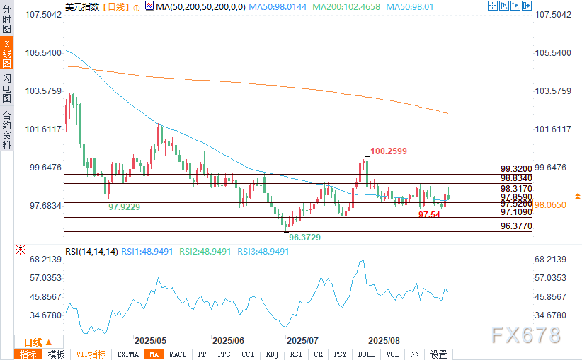 周三(9月3日),美元指数(DXY)在触及98.635这一短期新高后回落至98.044,该点位略高于98.000的50日移动平均线关键技术支撑位。近期美元指数回落,主要因市场对美联储独立性的担忧加剧,且对额外降息的预期持续对美元构成压力。