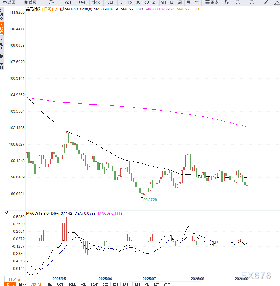 从技术面来看,美元指数(DXY)在日线图上已经跌破98整数关口,目前在97.40附近寻找支撑。短期均线呈现下行排列,显示空头压力依旧明显。