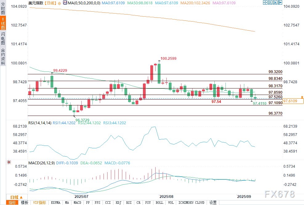 上周五触及的低点97.430目前是即时支撑位。若跌破该水平,下行动能可能加速,进一步指向7月24日的低点97.109。上行方面,交易员正关注关键阻力位——枢纽位97.859,其次是50日均线98.100,以及另一枢纽位98.317。