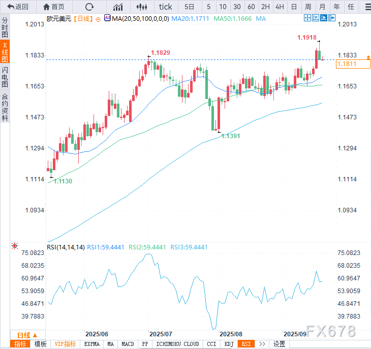 “欧元兑美元短期保持温和看涨态势。日线图相对强弱指数(RSI)稳居50上方,汇价交投于20日简单移动均线(SMA,1.1711)与50日简单移动均线(1.1666)之上。”