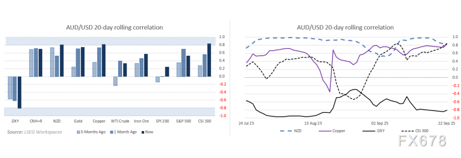 澳元与中国之间的关联正在重新调整,目前澳元/美元与铜及沪深300指数的20日相关系数已回升至0.8以上。其与纽元的关联性同样强劲,与美元的反向关系也保持稳固。