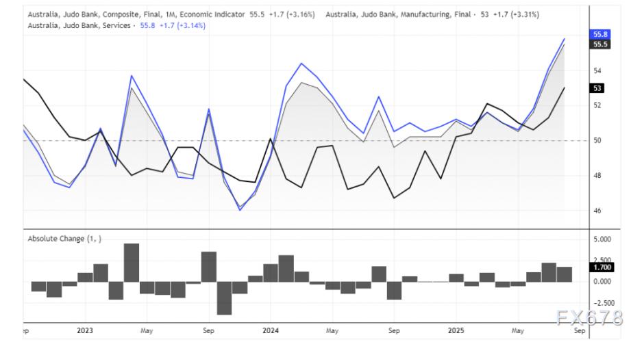 澳大利亚9月PMI初值将于周二公布。虽然这些数据通常不会对市场产生重大影响,但它们仍显示经济处于扩张区间。7月份服务业报告显示,活动水平创下三年多来最大增幅,就业、商业活动、出口以及前瞻性未来活动指数均有所提升,其国内外需求都在改善。