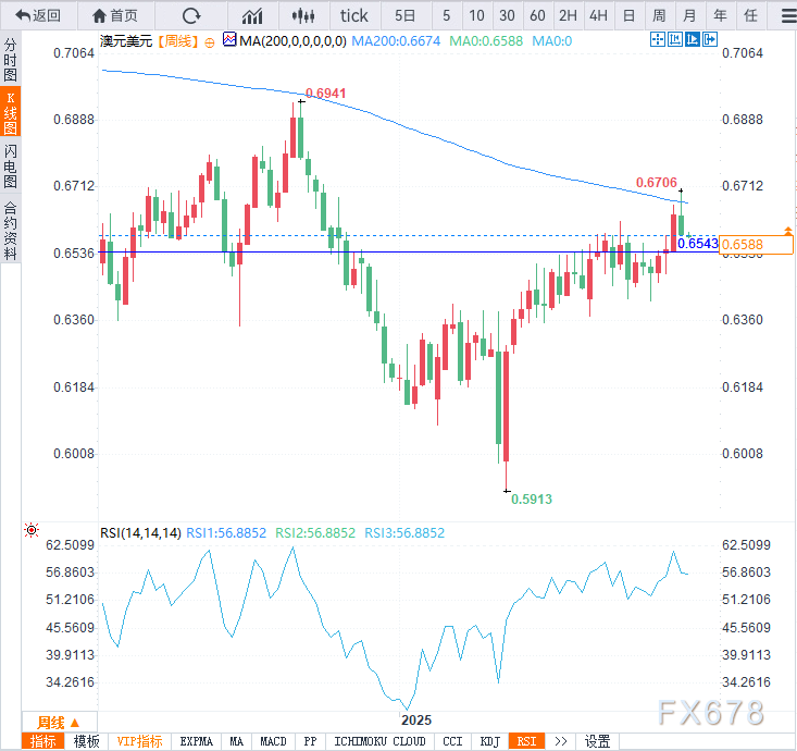 澳元兑美元汇率在0.6680附近的逆转并不让人意外,因为11月的高点(0.6706)和200周移动均线(0.6674)在此形成技术共振。