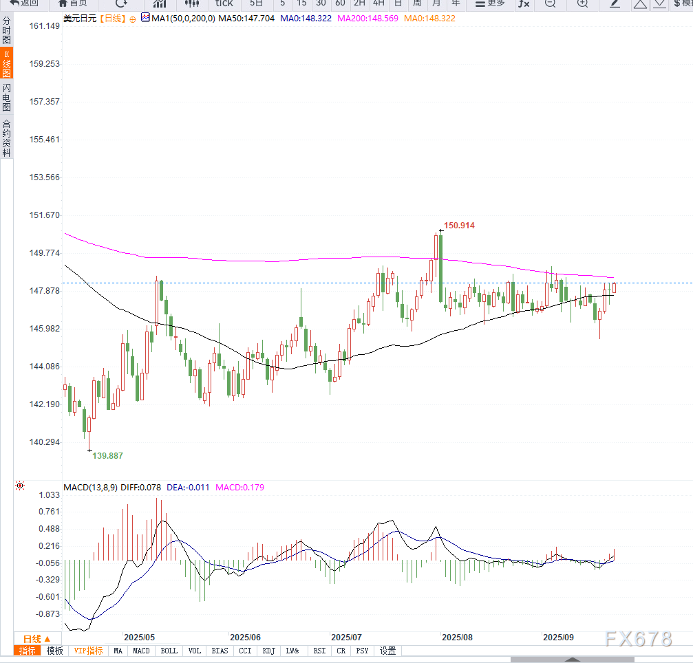 但从中长期看,若日本央行逐步推进货币正常化,叠加国内政策刺激,日元可能重新获得支撑。需重点关注148.60一线的突破与否,这将决定后续走势的方向性。