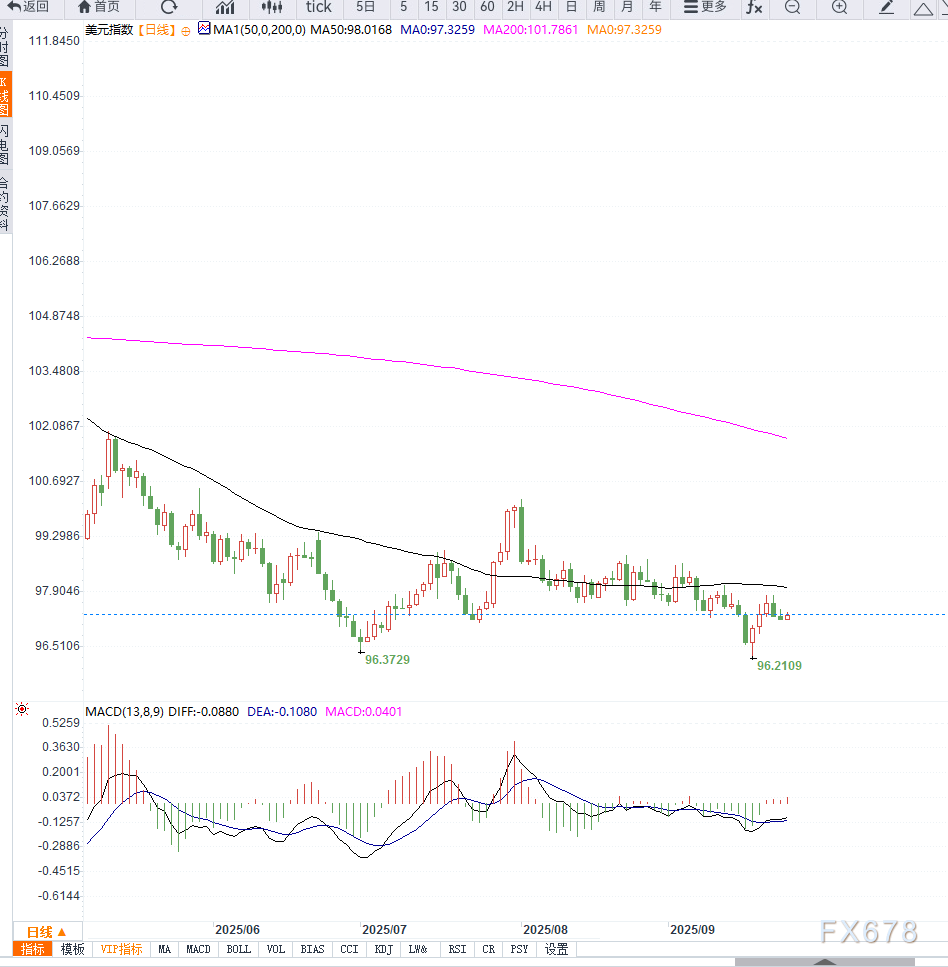 从日线图形来看,美元指数在96.80附近获得支撑后反弹,目前价格已重新站上97关口。短期均线向上拐头,显示出一定的修复动能。