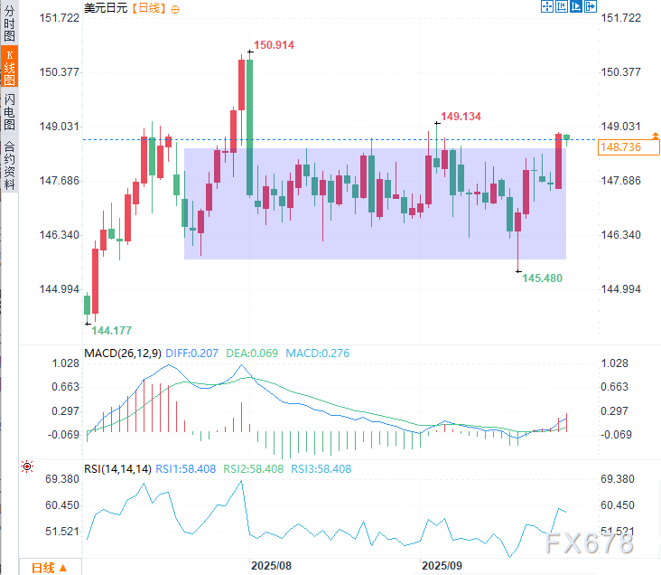 周四(9月25日)亚市时段,美元兑日元震荡微跌,目前交投于148.65附近,跌幅约0.16%。由于前一交易日金融市场出现新一轮避险情绪以及美联储的谨慎立场,美元兑日元汇率攀升至近三周高位,汇价在快速拉升后,目前进入技术性整理阶段。