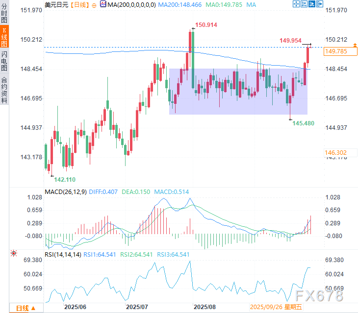 周五(9月26日)亚市时段美元兑日元高位持稳,现于149.70附近窄幅震荡,基本守住了前两个交易日的涨幅,在一系列强于预期的美国经济数据公布后,该货币对于周四晚间强势突破至近两个月高位,也逼近150整数关口。