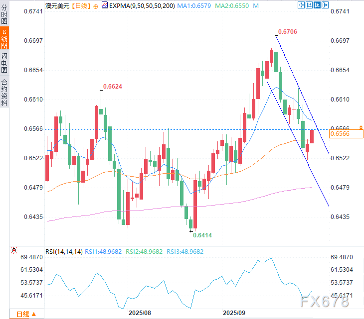 下行方面,澳元兑美元初步支撑位于50日指数移动均线0.6550,随后是下降通道下轨0.6500关口。若跌破该关键支撑位,将强化看跌倾向,汇价可能下探8月21日创下的三个月低点0.6414。