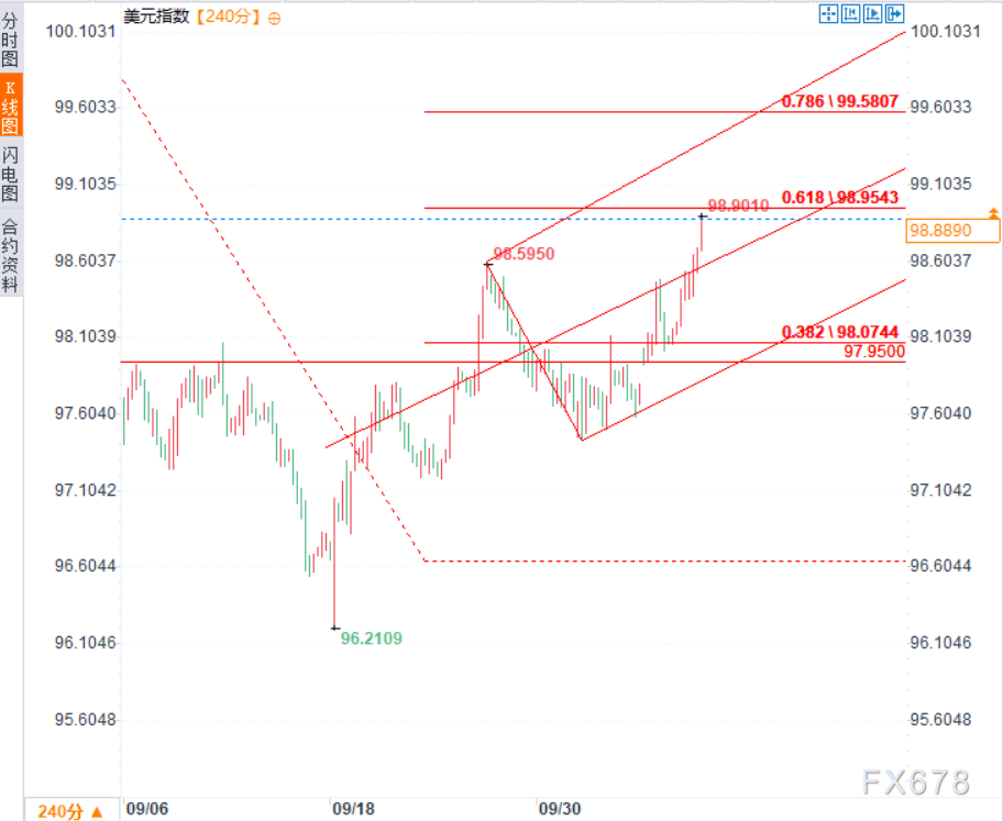 美元反弹走势正逼近九月高点附近的关键技术阻力,十月开盘区间恰于阻力下方初步成型。