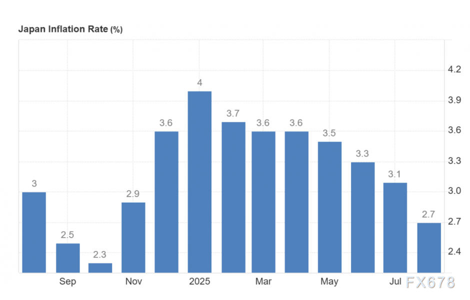 观察日本通胀曲线可见,虽物价涨幅有所回落,但8月最新数据仍达2.7%,持续高于2%的政策目标。这表明日本央行应维持紧缩政策以平抑通胀。然而政府的新财政方针可能削弱这一努力,导致通胀管控力度显弱,进而动摇市场对日元需求的信心。