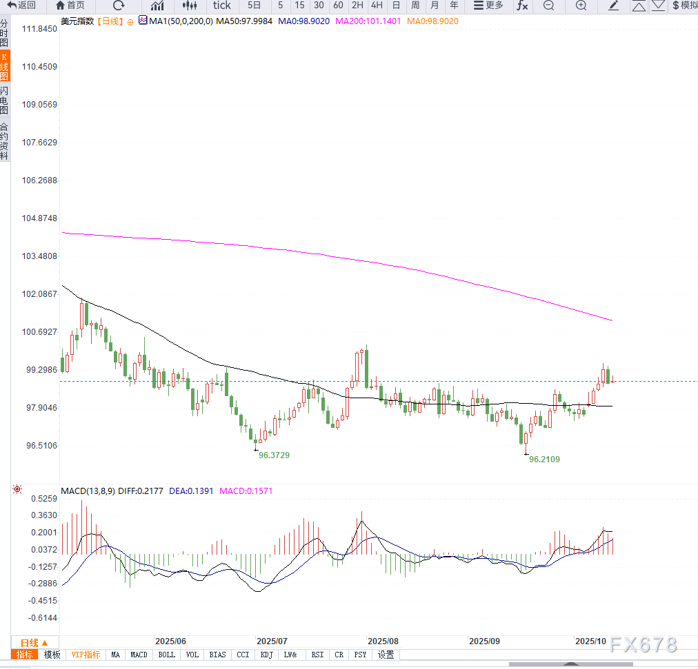 反之,若跌破98.50支撑,则可能触发短线回调,目标指向98.00附近。MACD指标显示动能温和上行,RSI位于中性偏强区域,显示美元短期仍有一定上行动力,但整体趋势仍受宏观不确定性影响。
