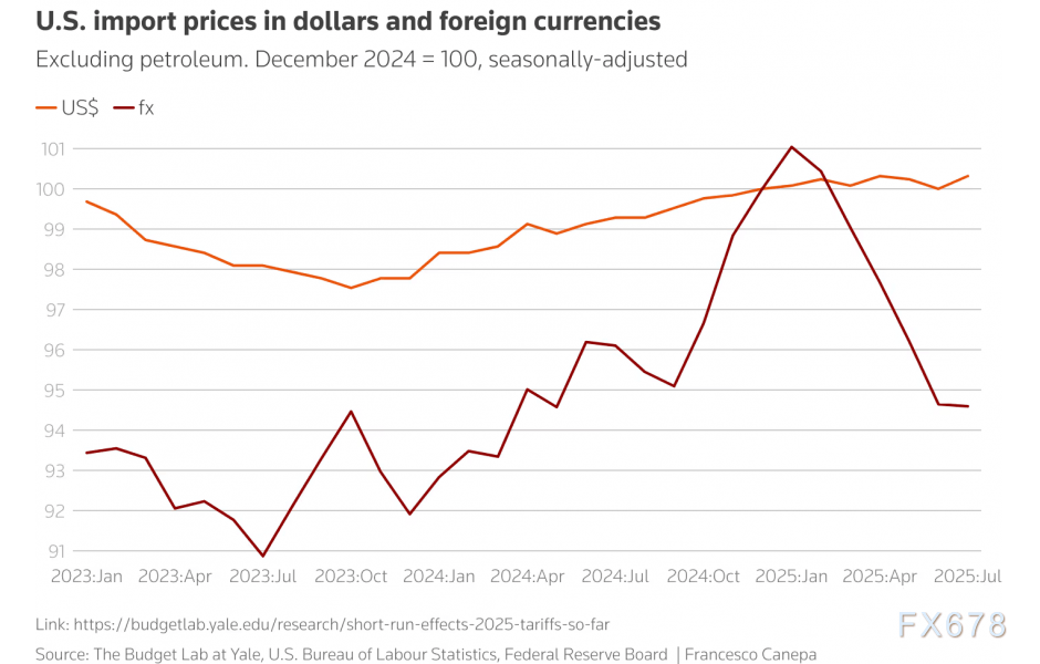 然而,不包括关税在内的美国进口价格显示,外国出口商一直在提高以美元计算的价格,并将美元对本币贬值的部分影响转嫁给美国买家。
