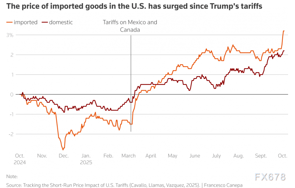 Cavallo和研究人员Paola Llamas、Franco Vazquez一直在追踪美国主要线上和实体零售商从地毯到咖啡等359148种商品的价格。他们发现,自特朗普3月初开始征收关税以来,进口商品的价格上涨了4%,而美国国内商品的价格上涨了2%。