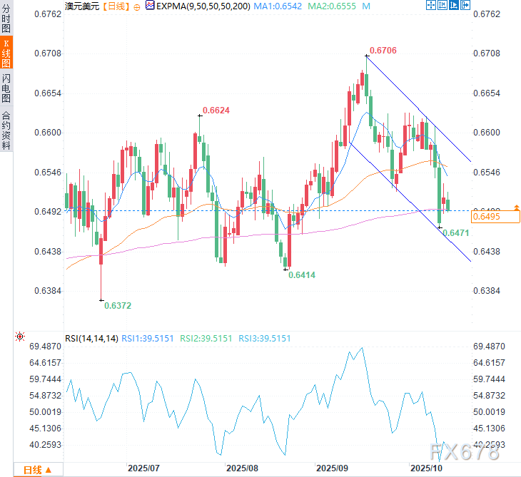 下行方面,澳元兑美元可能下探下降通道下轨0.6460附近。若有效跌破该通道下轨,将巩固看跌趋势,推动汇价测试8月21日创下的四个月低点0.6414,继而下探五个月低点0.6372。