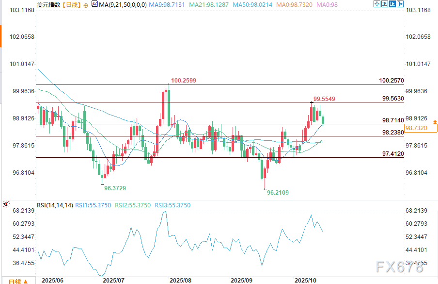 周三(10月15日)美盘时段,美元指数(DXY)延续下跌态势,跌破98.714这一关键斐波那契支撑位。背后原因有两点:一是交易员对美联储降息的预期不断强化,二是全球风险情绪回暖推升了对高风险货币的需求。