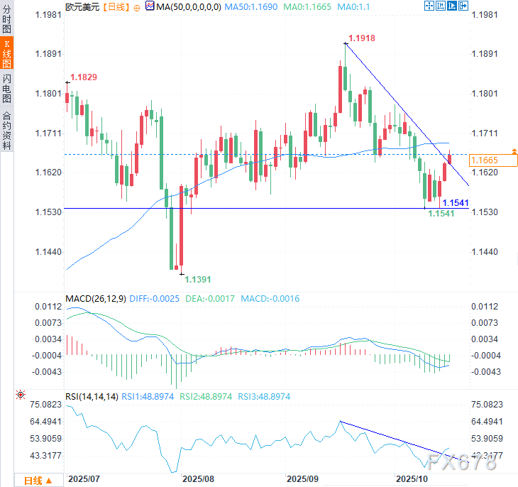 观察欧元兑美元日线图,可见汇价在周三已突破9月17日高点以来的下行趋势。此次看涨行情的触发点,是空头未能有效击穿10月9日低点1.1541支撑。