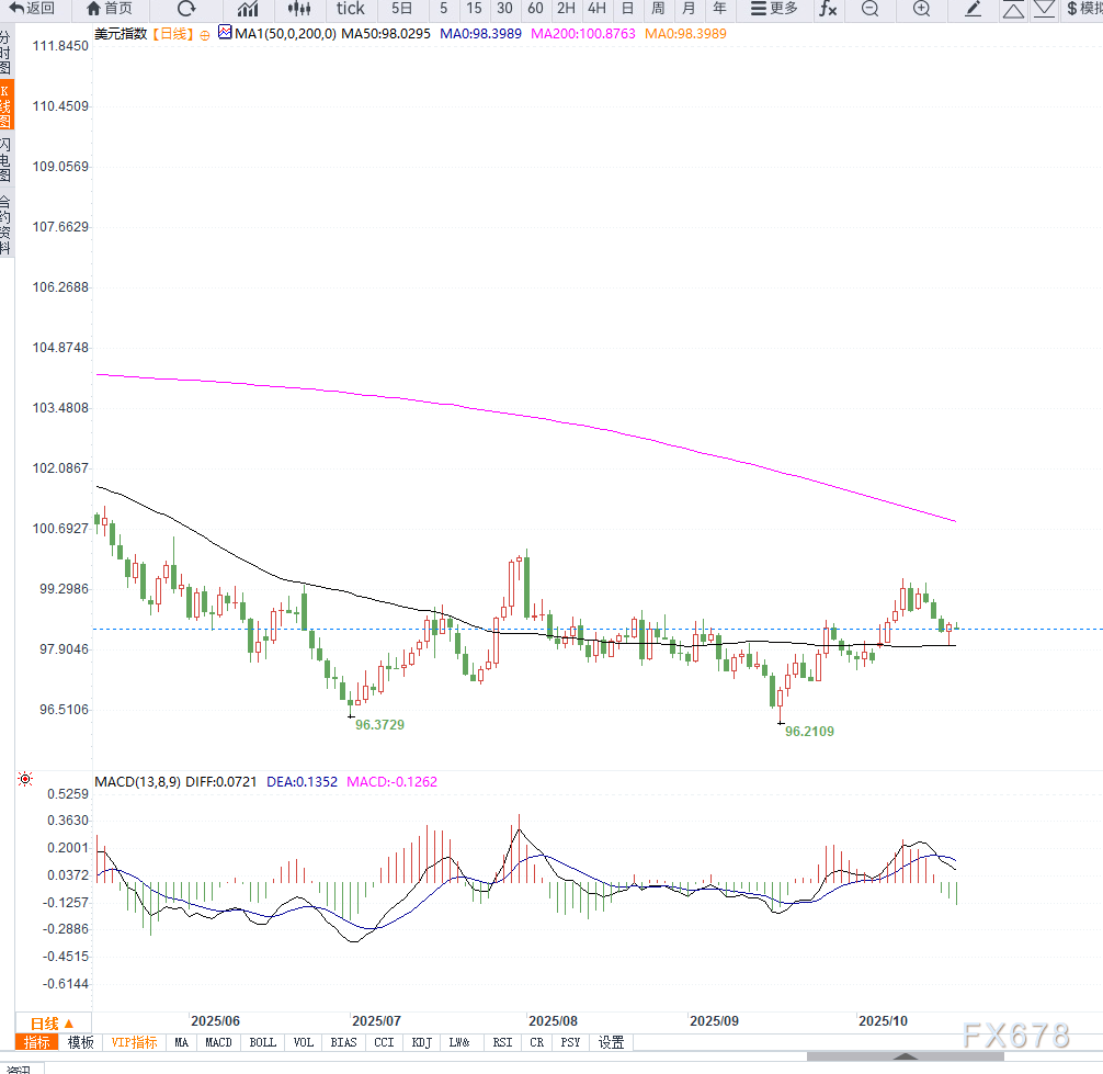 周一亚洲早盘,美元指数(DXY)小幅回落至约 98.40,延续上周涨幅的回撤。美元近期承压主要受美国政府关门拖延和美联储潜在降息影响。