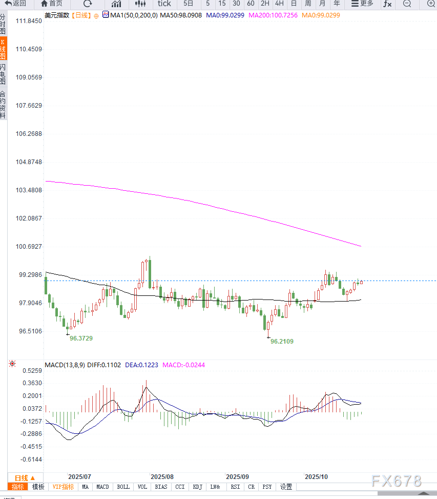 美元指数(DXY)在亚洲交易时段回升至约 99.00,延续了前一交易日的反弹行情。市场情绪受到美国总统特朗普预计与亚洲国家领导人会晤可能达成多项协议的支撑,这在短期内提振了美元需求。