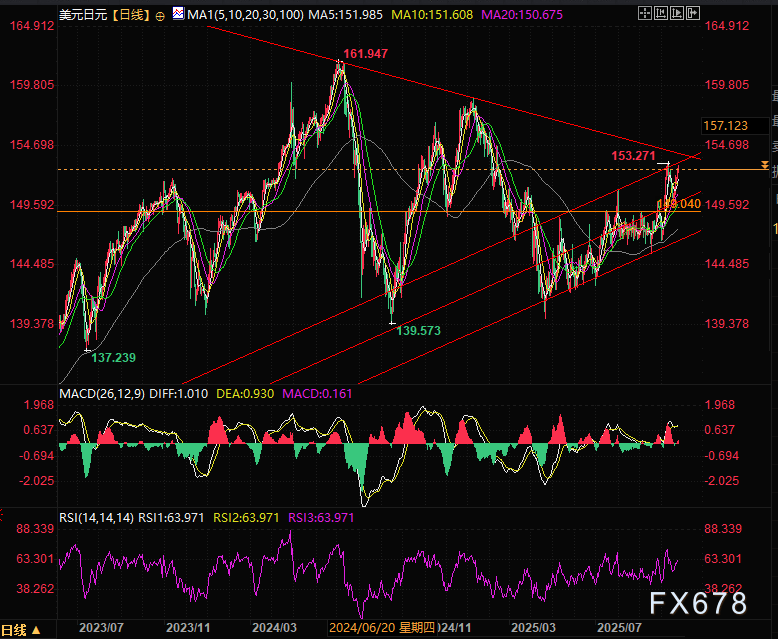从日线图可以看出,美元兑日元目前受制于上升趋势线上轨和下降压力线即153.70附近153.20-153.70位压力区间。