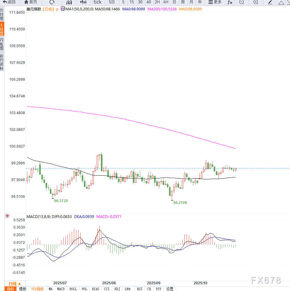 从日线图形看,美元指数在98.50附近获得明显支撑,并于MA20均线附近反弹。若价格能突破99.00整数关口,将打开进一步上行空间,目标指向99.45与99.80区域。