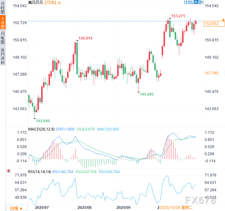 日元周四(10月30日)盘中遭遇部分抛压,此前日本央行决定维持现行政策不变,但跌势并未持续扩大。美元兑日元一度显著拉升,随后于153关口附近震荡。市场似乎不愿大举建仓,而是选择观望更多关于12月或明年初加息的线索——市场普遍预期日本新任首相高市早苗将推行激进的财政支出计划。