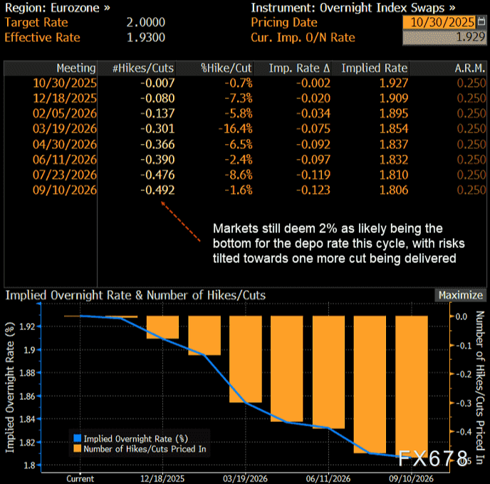 难怪市场预计欧洲央行将把利率维持到明年很长一段时间,掉期定价仍略微倾向于2%作为本轮周期存款利率的最低点。