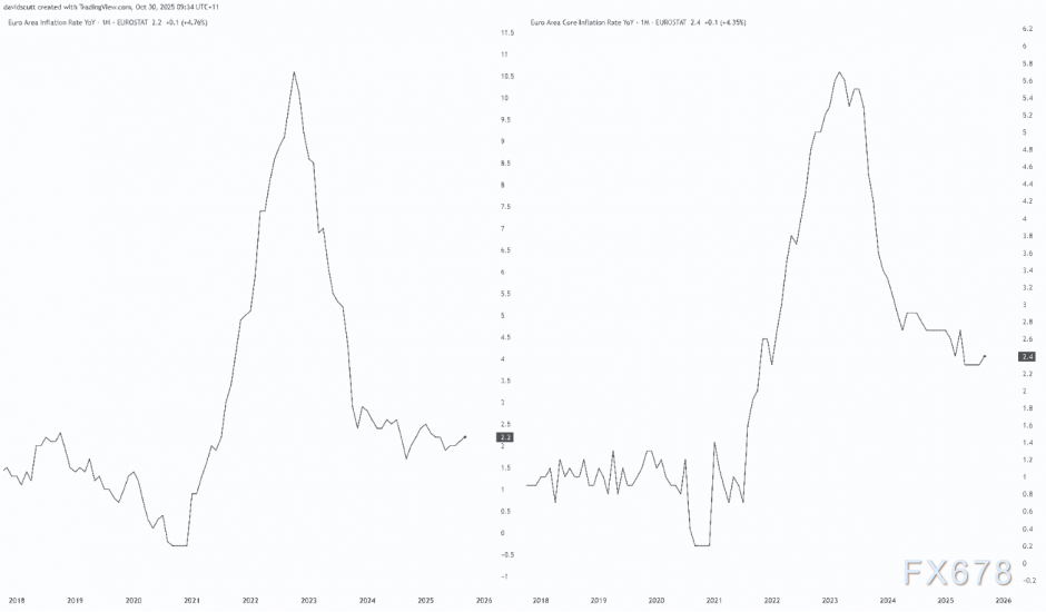 欧元区通胀指标也略高于目标水平,最新数据显示整体物价同比上涨2.2%,核心通胀指标则稍强达到2.4%。