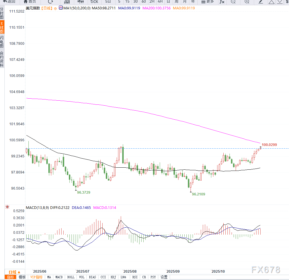 从技术角度来看,美元指数在99.50上方保持稳健上行结构,短期均线呈多头排列,14日相对强弱指数(RSI)位于60附近,显示多头仍占据主导。若突破100.20的关键阻力位,美元指数有望进一步上探100.80;