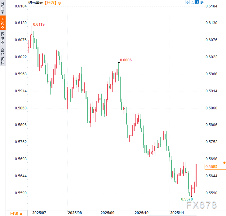 周三(11月26日)亚市时段,纽元兑美元显著攀升至与近三周高位0.5685附近,涨幅约1.17%,有望创6月2日以来最大涨幅。新西兰联储公布利率决议后,纽元兑美元走强。