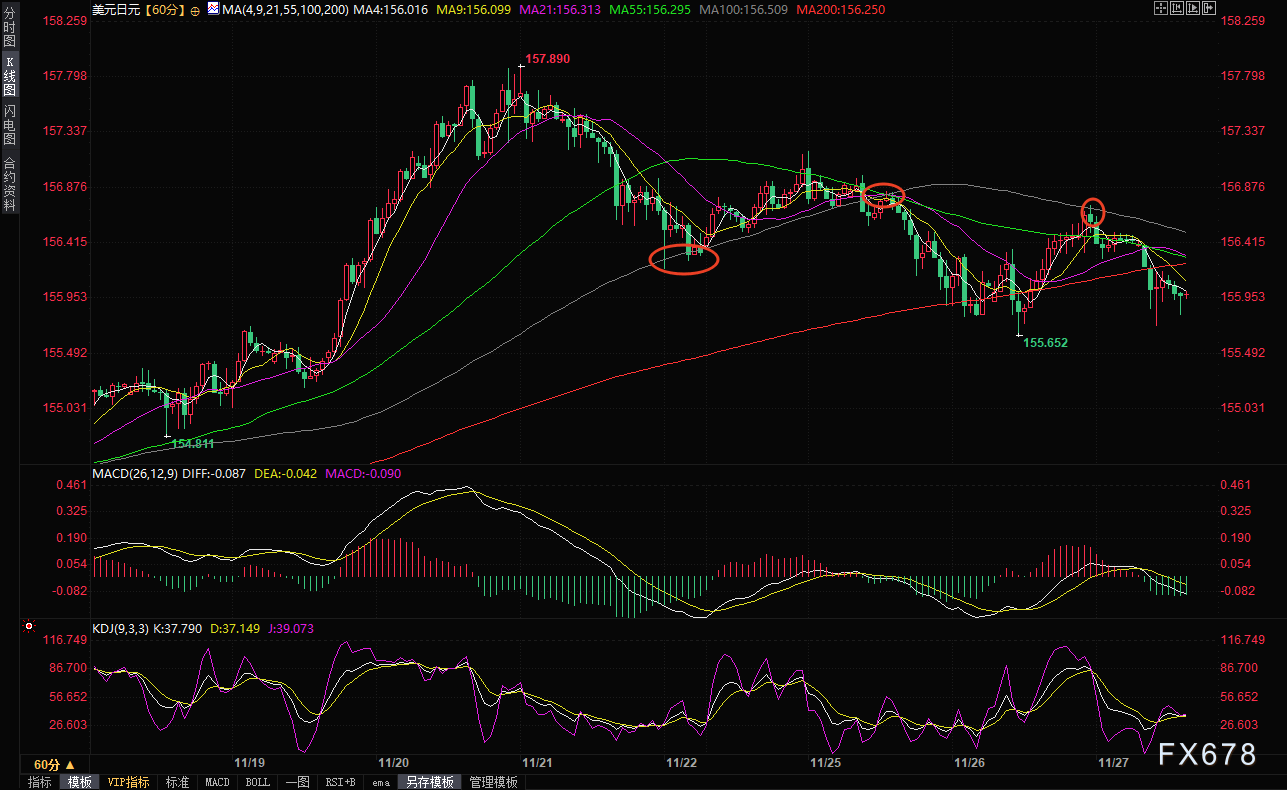 从短周期技术指标看,美元/日元隔夜上冲在100小时均线156.70附近遭遇明显阻力,目前该均线与前期下降趋势线重合,形成较强的技术压制区。