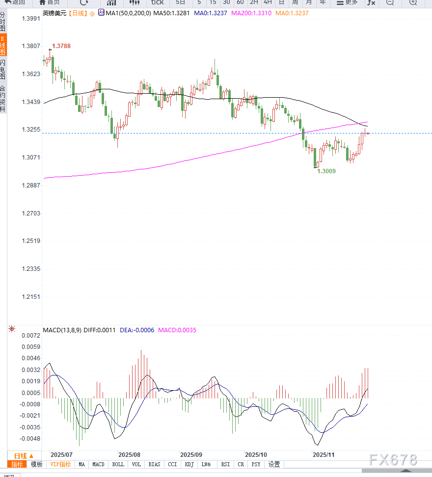 从日线级别来看,英镑兑美元已连续七日上涨,价格站稳在1.3200上方,显示多头动能显著增强。当前K线结构呈现稳步抬升形态,并连续收于短期均线上方,表明行情保持健康上行趋势。