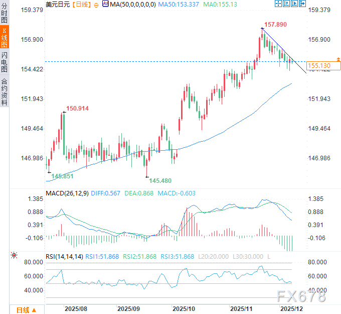 上行方面,若汇价能有效突破11月以来的下行趋势线,则上月高点(157.89)可能成为吸引汇率上行的重要目标,但需注意此前汇价在回调阶段曾于156.00和157.00关口附近反复争夺,这些整数关口将继续形成关键阻力。