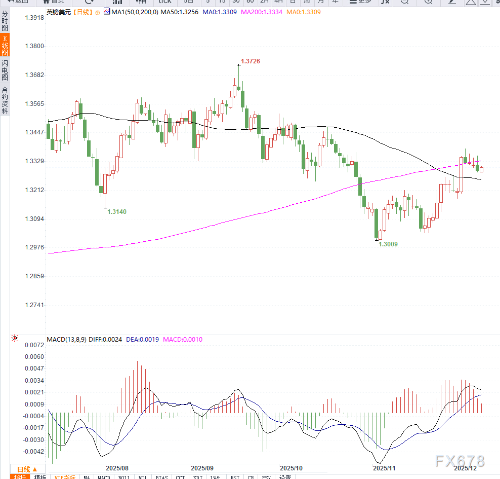 短期来看,GBP/USD 在美联储鹰派降息与英央行潜在降息之间处于拉锯状态。从日线图来看,GBP/USD 正处于 1.3250–1.3350 区间整理结构。价格在下方 1.3250 附近获得支撑,上方 1.3350–1.3380 区域形成压力带。