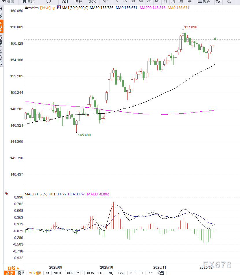 若能突破157并站稳,则有机会进一步试探157.45与11月的158高点。但一旦跌破155关口,多头结构将遭到明显破坏,短线趋势也可能转向。
