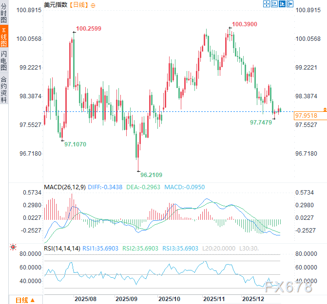 美国最新公布的GDP数据虽未显示技术性衰退,但深入剖析其构成后可以发现,当前经济增长存在严重的结构性缺陷和不可持续性。这种“表面增长、内在虚弱”的经济状态,或将对美元指数构成复杂而偏空的中长期影响。周一(12月29日)亚市早盘时段,美元指数于97.95附近窄幅震荡,位于10月初以来低点(97.75)附近上方不远处。