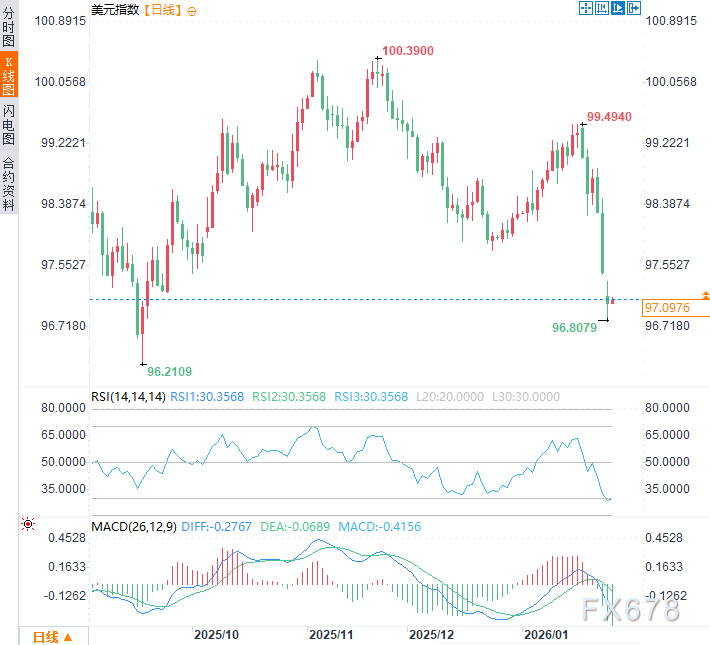 周二(1月27日)亚市时段,美元指数于97.10附近窄幅震荡,此前美元指数连续三个交易日下跌,一度触及96.81的逾四个月低点,符合此前市场预计2026年美元将在2025年下半年的休整后重拾跌势。引人关注的是市场对哪些因素做出反应,又对哪些因素视而不见。