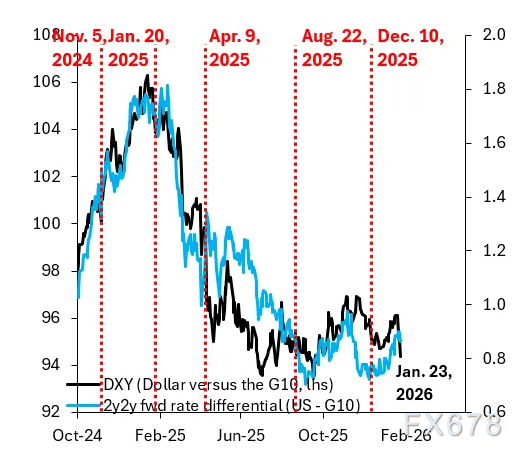 现在发生的情况与此非常相似。上周美元的急剧下跌再次伴随着2y2y远期利率差的下跌。市场认为,围绕格陵兰岛的争端以及美国处理此事的混乱方式,将反噬美国,并要求美国相对于G10国家降低利率。