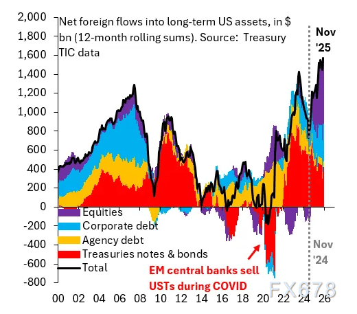 下图显示,流入美国资产的外资非常强劲,这不禁让人产生疑问:既然有这么多人在买入美国资产,美元怎么可能持续下跌呢?